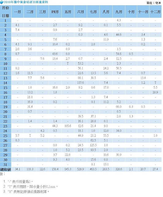 雨天,當然不必澆水,所以查了中央氣象局的統計資料。台中觀測站去年2010年共下了2054.4毫米的雨,一年365天,一共下了106天雨(雨量不到1毫米的不計入),通常下雨的隔日,雨量夠多的話,因為土壤還是溼潤的,所以也不必澆水,雨下得多時,可以多日不澆水,用保守一點來估計,每遇下雨日,有一半機率隔日也不必澆水,所以一年有106X(1+0.5)=159日不必澆水。